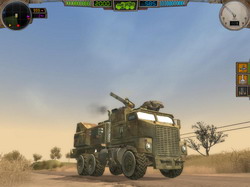 Суровые будни военизированного дальнобойщика призвано скрашивать весьма и весьма приятное графическое исполнение. Без особого выпендрежа и сверхтехнологичности, всего в меру и почти все симпатично. Дизайн локаций довольно неравномерен, некоторые пейзажи смотрятся просто великолепно, а где-то вы ничего, кроме лысых холмов с размытыми текстурами не увидите. Шейдерная водичка реализована не слишком удачно — если в ней что-то отражается, то все путем, а вот большие водоемы с пустующей береговой линией выглядят мертвенно серыми и неестественными. Техника хорошо детализована, грамотно текстурирована — бамп на металлических частях, отражения в стеклах и вполне убедительный хром, плюс честное отображение внешних апгрейдов. В то же время, хваленая система повреждений подкачала — всевозможные деформации кузова оказались крайне однообразными и не соответствующими реальному состоянию автомобиля. Даже после легкого столкновения, отбирающего две-три единицы «здоровья», колеса начинают болтаться, кабина мнется, как картонная коробка, а изо всех возможных мест выскакивают малосимпатичные искры, в сопровождении такого же малосимпатичного дыма. Картинку портит здорово. В качестве компенсации — красивые эффекты от столкновений и выстрелов, скажем, при неудачном контакте с телеграфным столбом изображение размывается, при получении ракеты под зад становится черно-белой, а выстрел по вашему грузовику из энергетического оружия временно искажает и цвета, и формы.